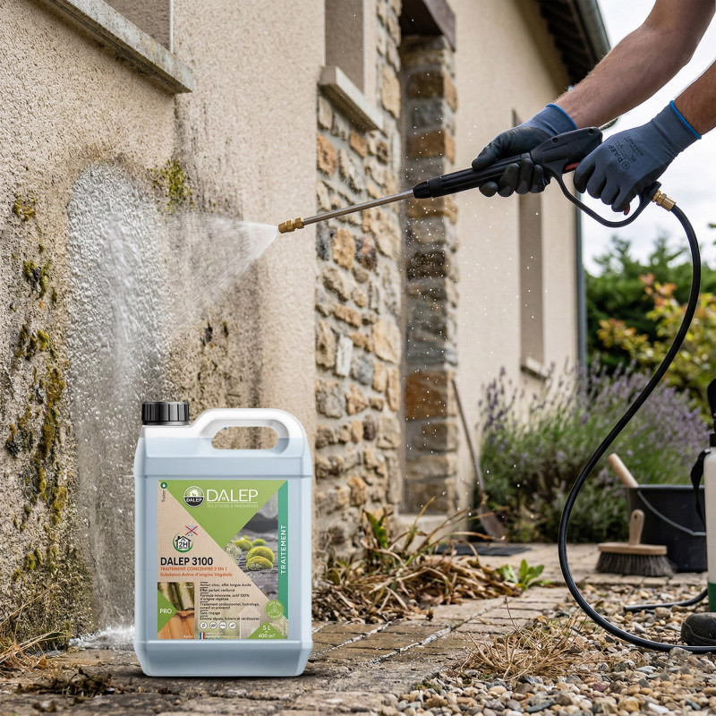 DALEP 3100 est un fongicide professionnel concentré à diluer. Il traite les supports contre tous les types de champignons, algues, lichens et imperméabilise en une seule opération.
